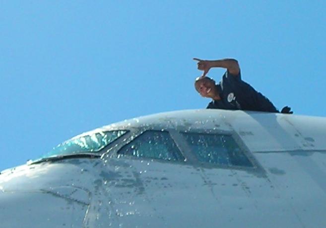 While standing around waiting for the wiki-wiki bus to come and get us, the mechanic crawls out the hatch and with a bottle of water, wets the windshield, and uses the windshield wipers to clean the windows (windows of the 747, unlike other airliners, don't open).