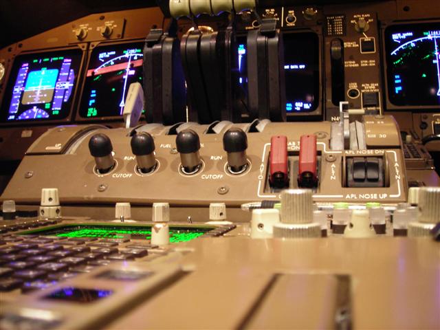 The center pedestal with the four fuel control switches and the four throttles. Photo taken in the middle of the night over the Amazon enroute to Sao Paulo, Brasil.
