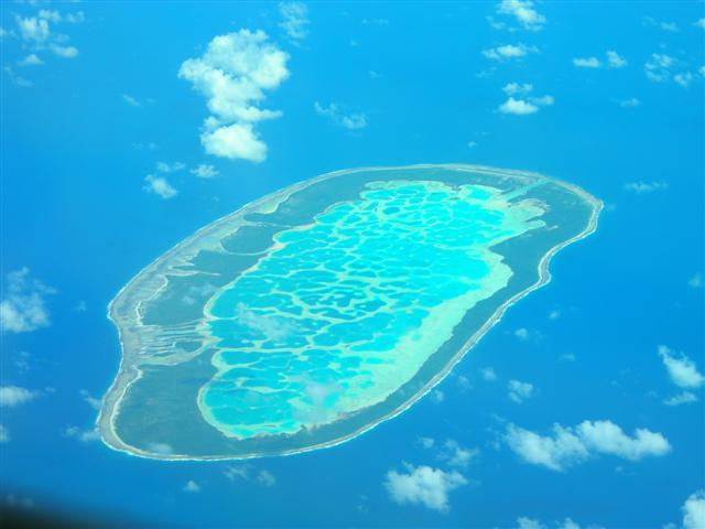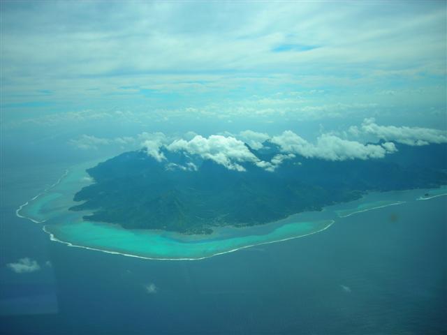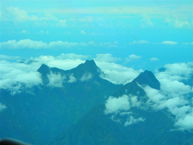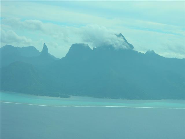 Shortly after passing through the ITCZ we flew over several coral ATOLLs like the one pictured below just before the top of descent. Following the photo of the atoll are photos of the descent and landing in Papeete. The photos were taken by Captain Tom Holman since I was very busy at work playing pilot for the day.